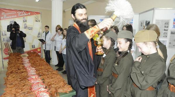 Одним из главных фетишей, связанных с Днем Победы, стала георгиевская лента, использование которой в акциях памяти началось в год 60-летия Победы и с тех пор дошло до абсурда. С одной стороны партии георгиевских лент перед раздачей освящают на специальных молебнах; с другой стороны их заплетают в косы и даже используют вместо шнурков, а потом просто бросают в урны. По Кодексу «Георгиевской ленточки» (см. Википедию), не допускается её использование в политических целях любыми партиями или движениями. Между тем, раздача георгиевских лент в промышленных масштабах за счет госбюджета уже превращает эти акции в провластно-политические, всё с той же целью: заявить об особом праве России на Победу и о прямом отношении к ней нынешней кремлевской власти. Для самих же ветеранов символом Победы георгиевская лента никогда не была.